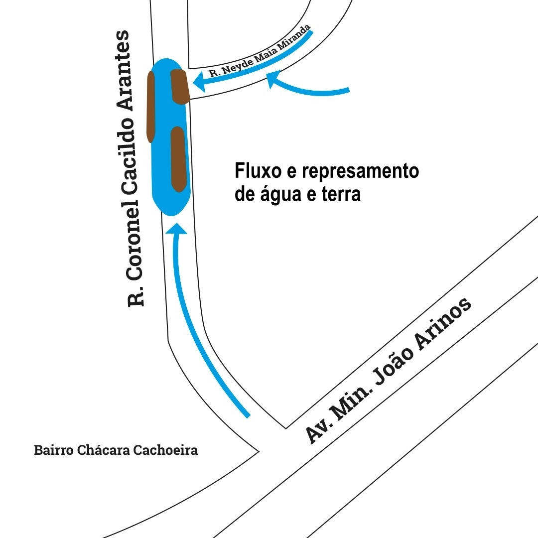 Nos dias de chuva, a região do cruzamento das ruas Coronel Cacildo Arantes e Neyde Maia Miranda recebe o volume de águas pluviais da Av. Ministro João Arinos, da própria Rua Neyde Maia Miranda e de uma rua não mapeada que fica atrás do Expresso Mira, de onde desce toda a terra que invade a Rua Coronel Cacildo Arantes, como é possível perceber na ilustração ao lado.